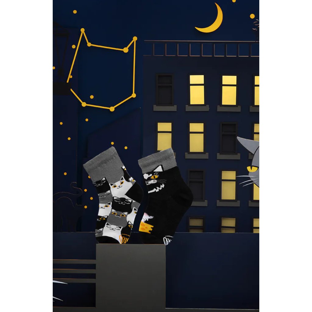 Die lustigen Socken mit schwarzen Katzen werden Sie mit ihrer geheimnisvollen Atmosphäre verzaubern. Sie sind hauptsächlich aus Baumwolle gefertigt, die sich weich anfühlt und Ihre Füße dank ihrer Saugfähigkeit frisch hält.